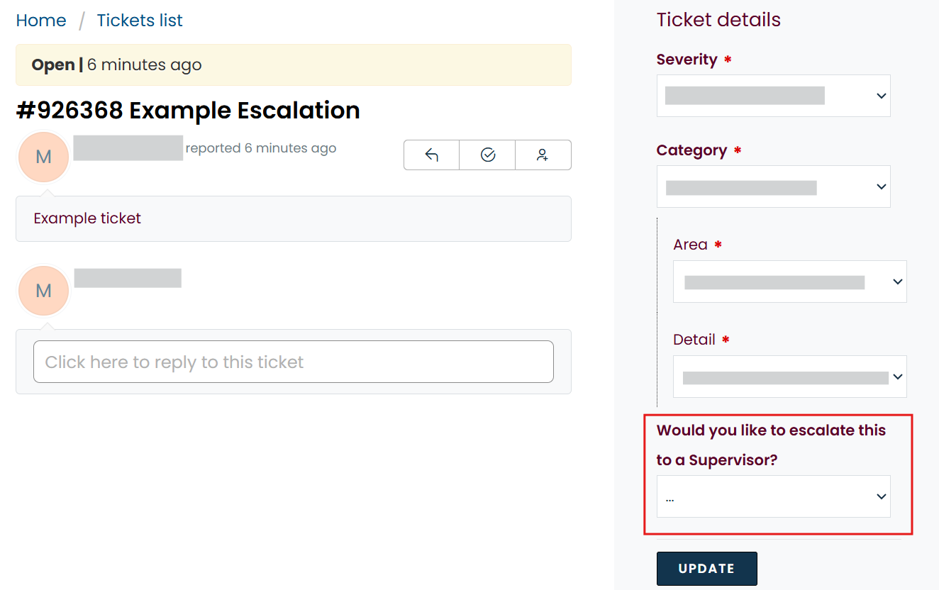 - In the field, Would you like to escalate to a Supervisor? select Yes from the dropdown and then click UPDATE.